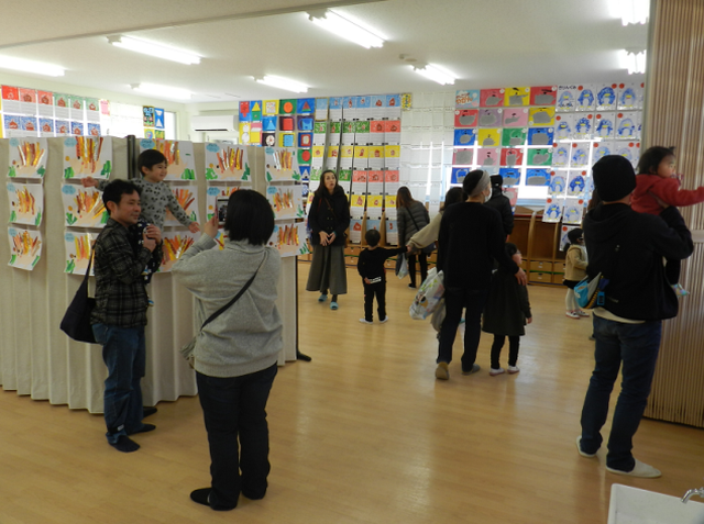 同じ週の週末は、作品展が開催されました。今年は、ホール以外に2教室も使い、かなり広いスペースに作品を飾りました。満三歳児・年少、年中、年長の学年ごとに共同制作のテーマを決め、大きな背景(例えば、年長さんは学校、年中さんは線路、年少・満三歳児は音楽の家)を共同制作し、その中に自分たちの製作物を置くといった形の共同制作をはじめとし、絵画、作文等、学年に応じた作品が数多く展示できました。子どもたちは朝から保護者の方々と一緒に来園し、自分たちが製作した作品を自慢げに見ていました。