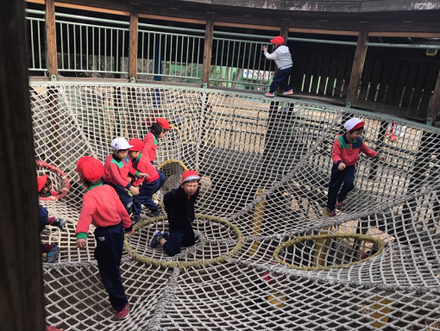 年長さんの遠足は、車で30分ほどの施設に行って、大きな遊具での外遊びや外でのおやつ、体育館ではドッヂボールの練習をしました。大きくて、きれいな食堂でのお昼や学校の教室で机やいすに座って、小学生気分で製作もしました。とても盛り沢山な1日でした。