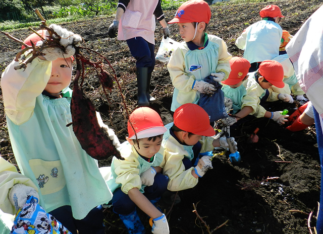 おさひめ幼稚園の行事日は、天気予報が外れて、晴れの日が多いのですが、今年は、なかなか、そのようにはいかないようです。お芋ほりの予定日の10月25日(金)は、終日雨で、30日(水)に延期しました。前日にも雨が降り、ちょっと心配しましたが、30日(水)は久々の晴れで、少し泥んこになりましたが、楽しくお芋ほりができました。といっても遠出をしたわけではなく、園バスで、6,7分でいける農園でのお芋ほりです。園の周りは、まだまだ自然がいっぱいです。満三歳児さんや年少さんには、お芋の根っこを掘るのはちょっと大変でしたが、先生の手助けもあり、みんな大きなお芋を手に園へ戻りました。今日の夕飯は、ご家族で楽しめることでしょう。